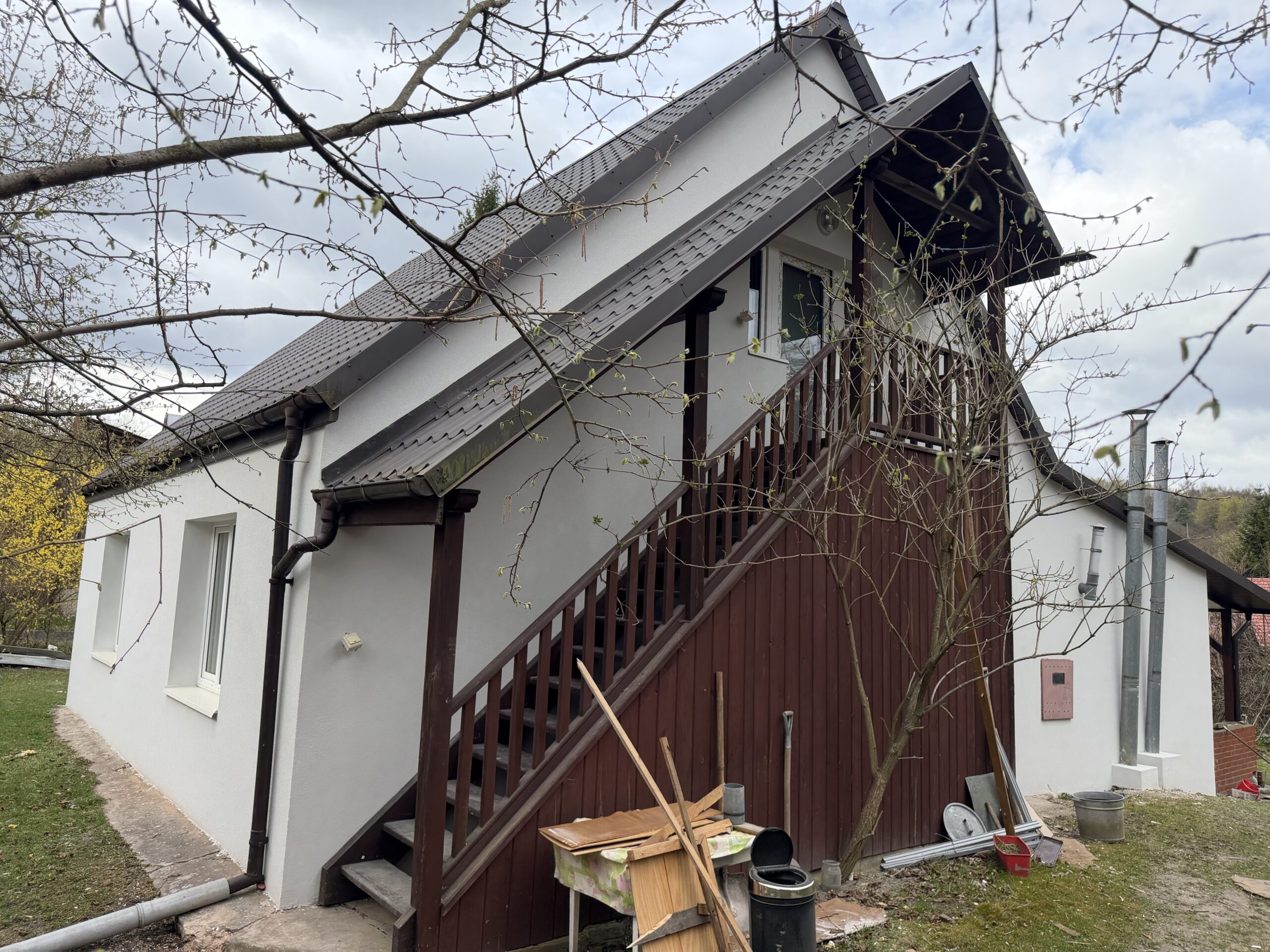 Mówią, że „diabeł tkwi w szczegółach”, a my dodajemy: szczegóły to nasza specjalność. Prezentujemy efekty prac przy budynku, który wymagał dużej precyzji wykonawczej. Dla ekipy MAKO OZE skomplikowane konstrukcje to po prostu standard pracy. Aby zachować pełną ciągłość izolacji oraz zadbać o estetykę, przeprowadziliśmy profesjonalny demontaż drewnianych schodów oraz elementów przytwierdzonych do ścian. Dzięki temu wyeliminowaliśmy mostki cieplne, a po ociepleniu wszystko wróciło na swoje miejsce.
