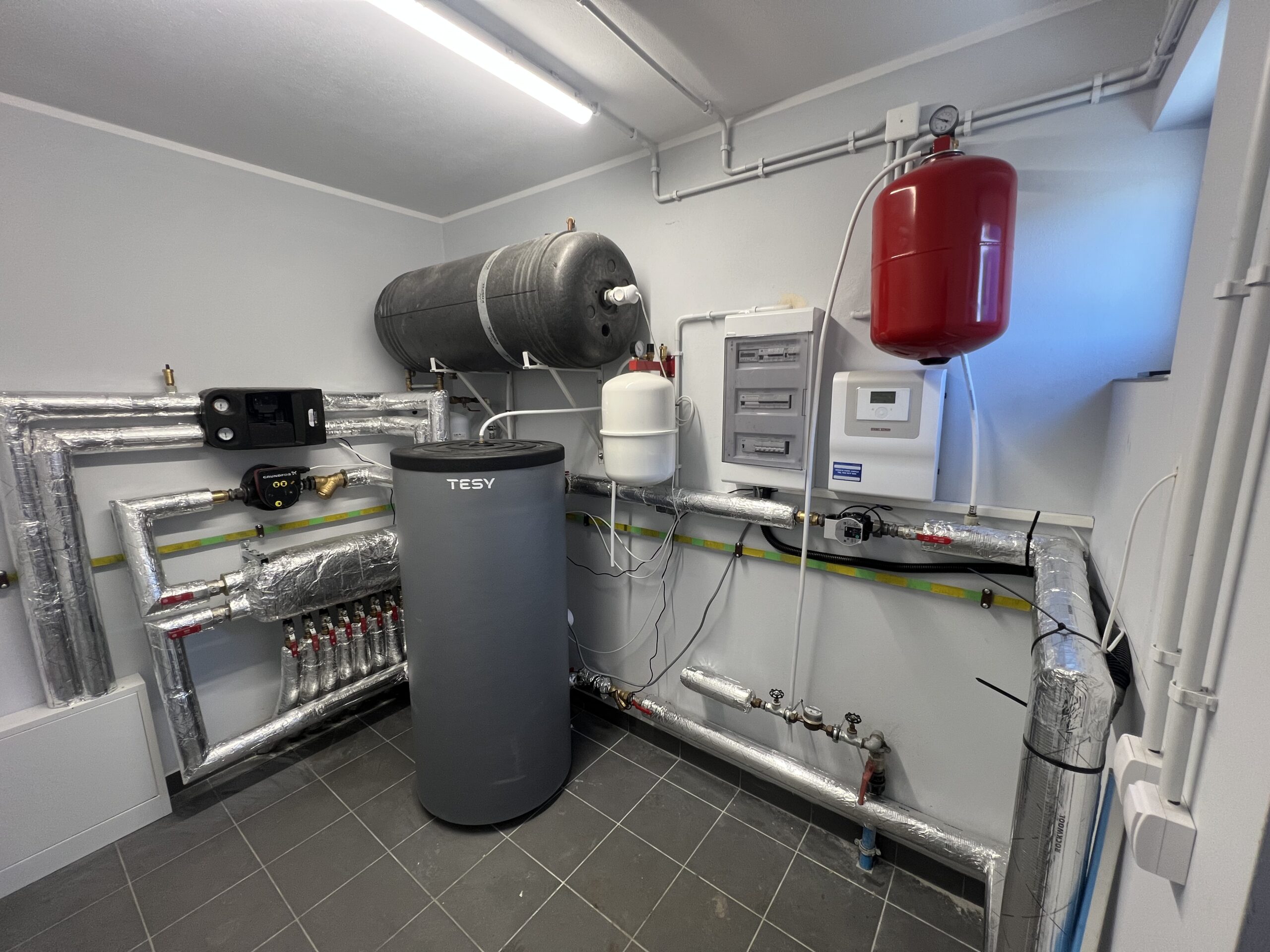 System został indywidualnie dobrany do zróżnicowanej instalacji (grzejniki + podłogówka), zapewniając komfort cieplny w całym budynku. Pompa pracuje cicho i efektywnie, obsługując zarówno centralne ogrzewanie, jak i ciepłą wodę użytkową.